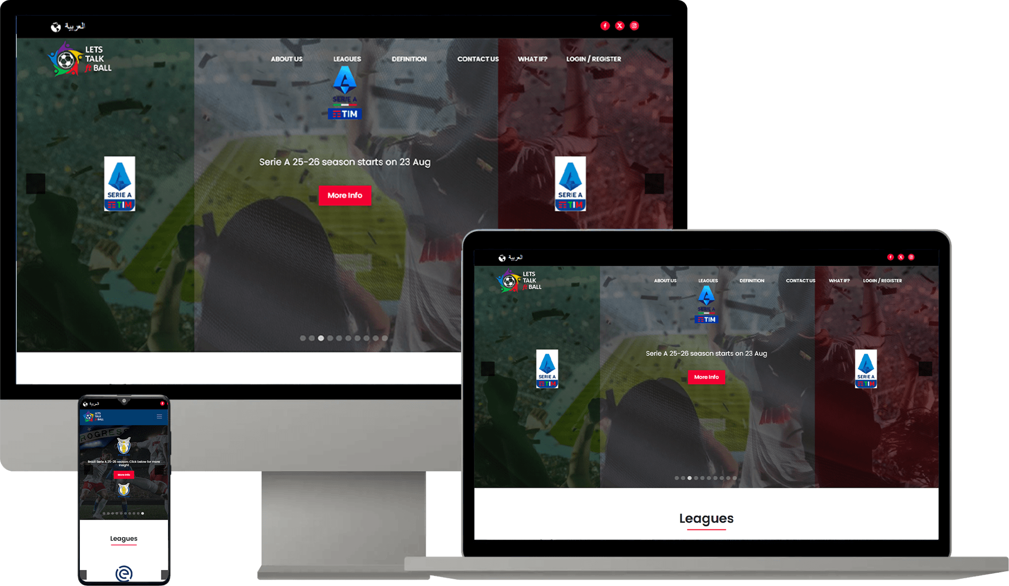 Let’s Talk FT Ball is a vibrant online platform designed for football enthusiasts to discuss, follow, and engage with major global leagues. The bilingual (English/Arabic) site highlights upcoming seasons like Serie A 25-26 starting August 23, features league overviews, live social feeds, and community tools to connect fans worldwide for real-time matches and debates.